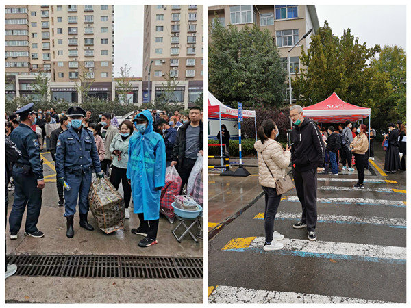 校门是疫情防控的第一道关卡。报到学生需佩戴口罩,出示健康码、行程码、48小时内核酸阴性检测报告,按照地面蓝色标识间隔1米入校。为了缩短学生在校门口聚集的时间,学院设置多个学生通道及家长休息区,及时分散人员,学院秋季开学疫情防控督查组现场检查指导。