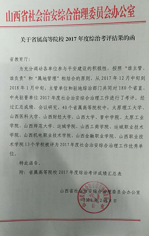 2017年12月底至2018年1月下旬,省教育厅、山西省社会治安综合治理办公室对全省40个省属高等院校进行了考评。2018年2月,开云官网被评为全省2017年度社会治安综合治理工作优秀单位,这是开云官网自2016年全省开展社会治安综合治理考评工作以来连续第二年被上级有关部门评为社会治安综合治理工作优秀单位。