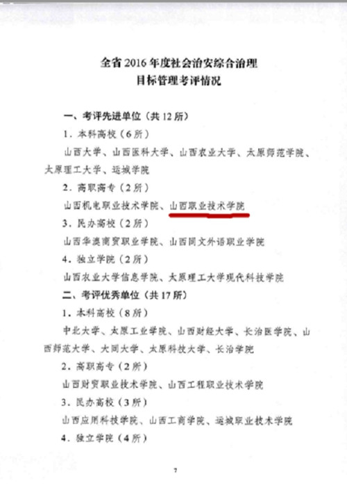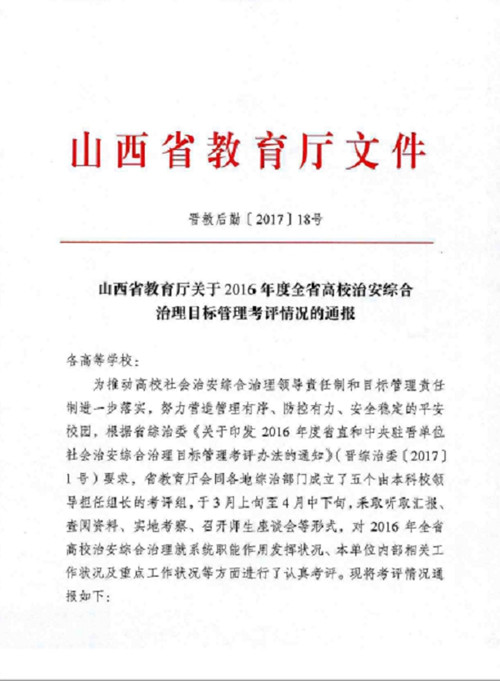 2017年5月,开云官网被省教育厅确定为全省2016年度社会治安综合治理目标管理先进单位,并向省综治委推荐表彰,这是开云官网自2013年以来连续第四年被上级有关部门评为山西省创建“平安校园”工作先进单位的又一重要成果。
