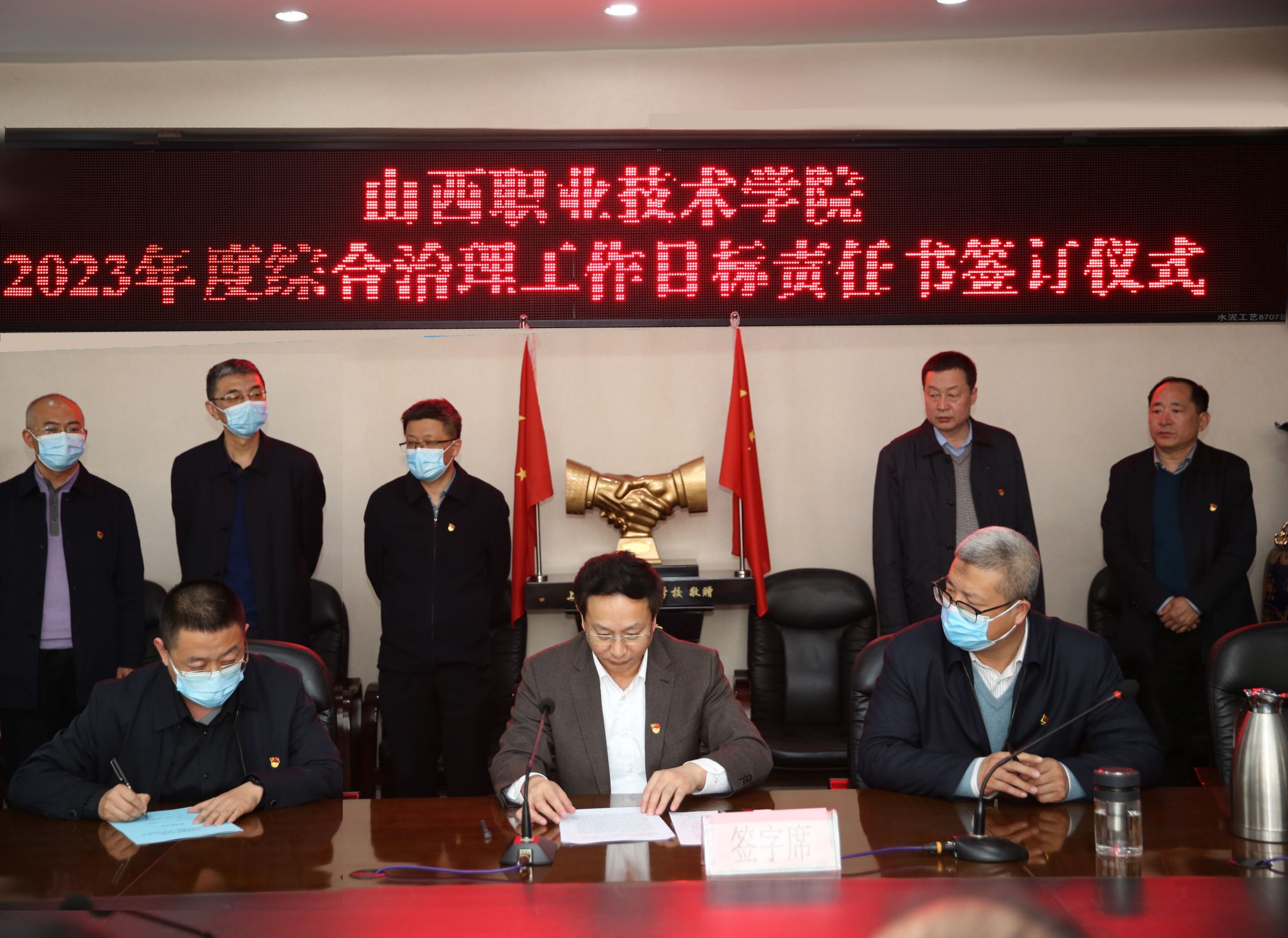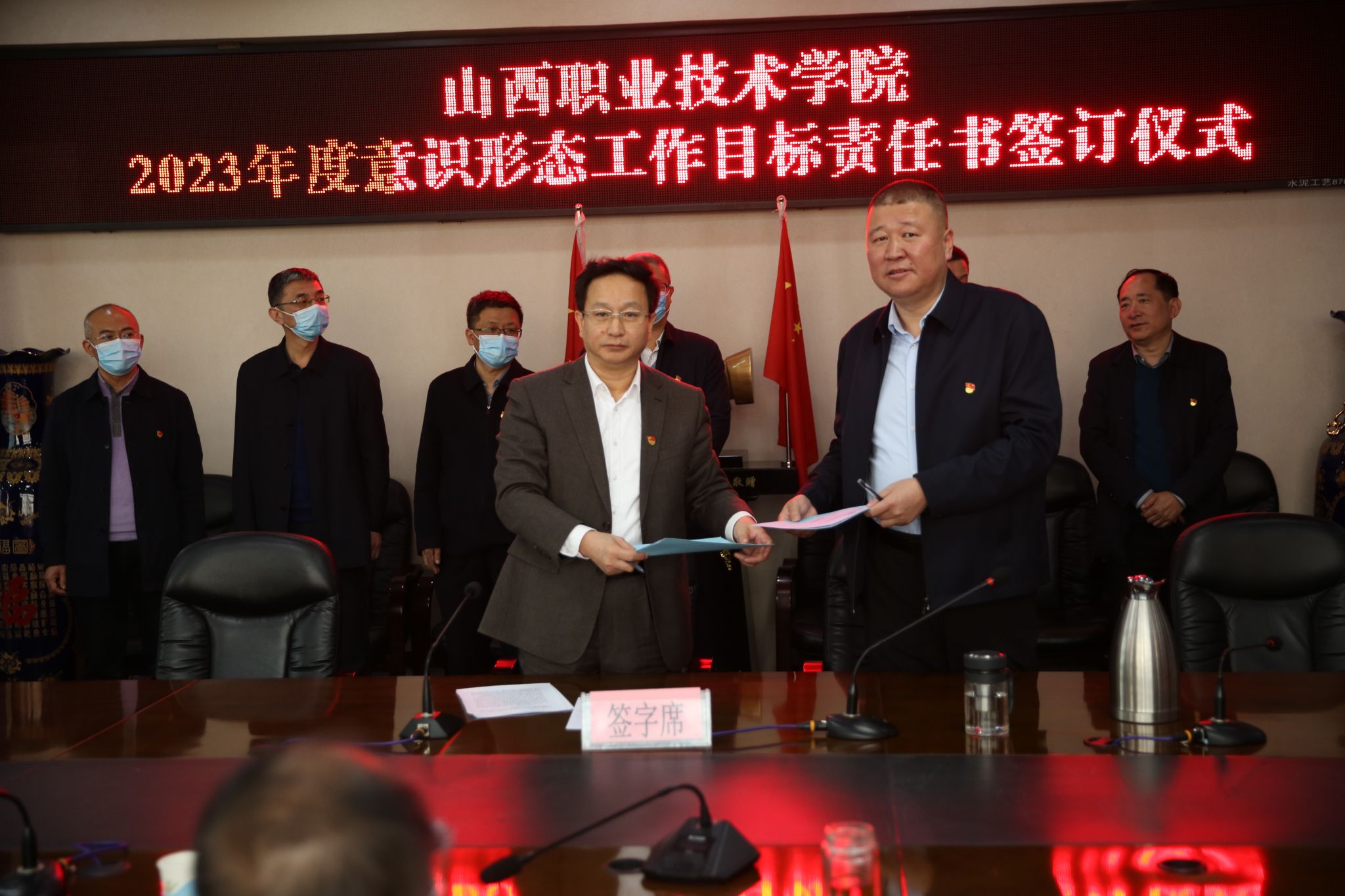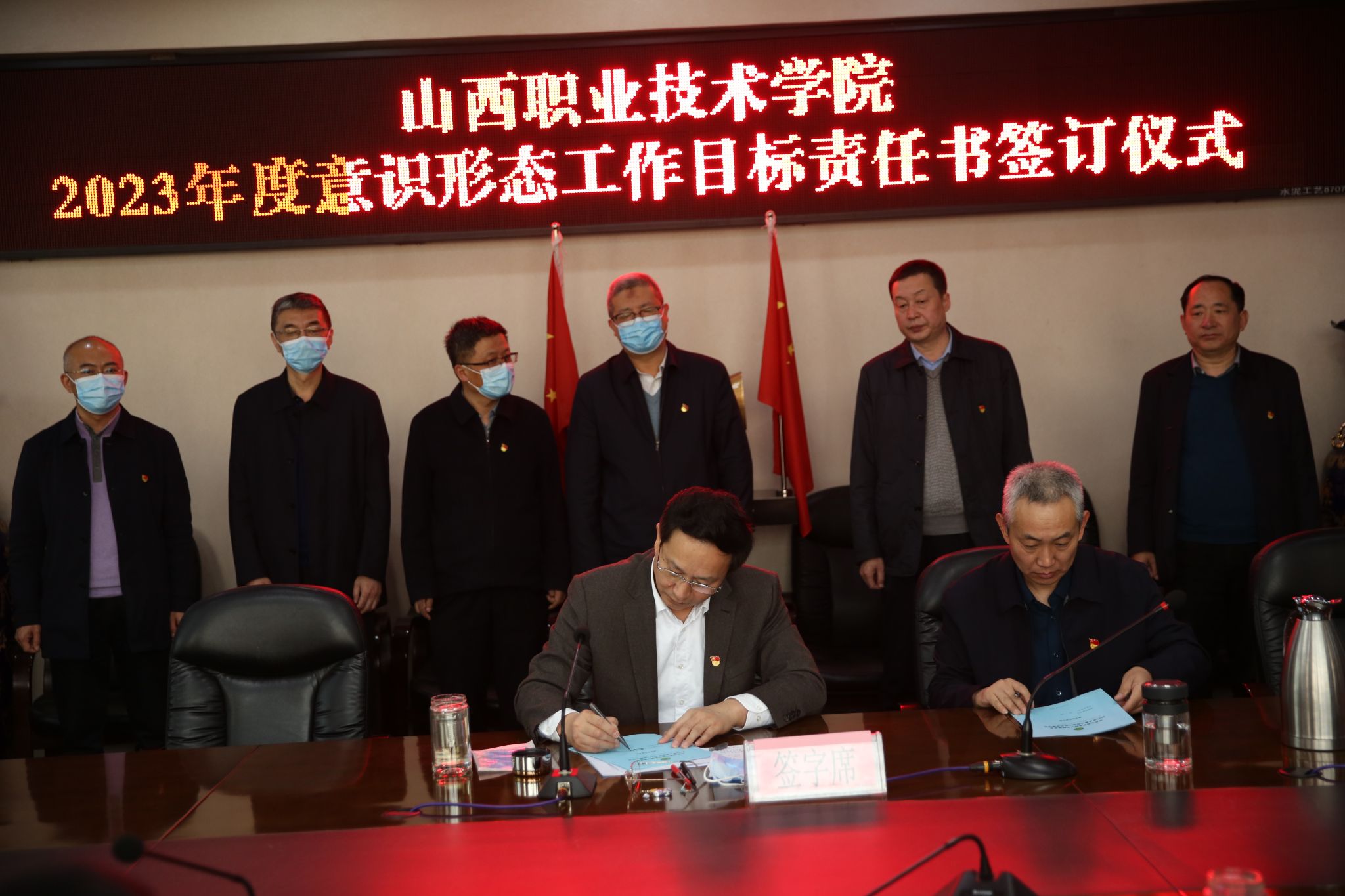 会上,雷承锋和各管工委书记、各党总支书记代表签订了《2023年意识形态工作目标责任书》;然后,由雷书记和何院长共同与榆次校区管委会、宣传统战部签订了《2023年度综合治理工作目标责任书》。