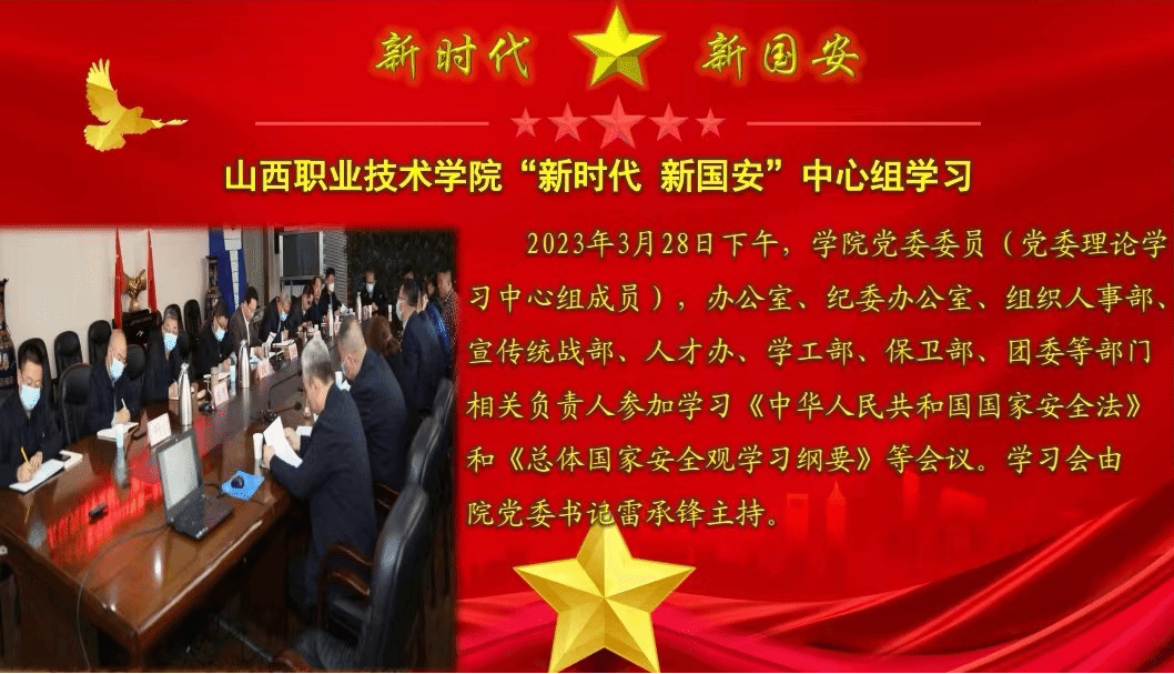 今年4月15日是第八个全民国家安全教育日。为落实好全省教育系统全民国家安全教育日宣传教育活动,深入推进国家安全意识入脑入心,切实增强广大师生维护国家安全的意识和能力,培养爱国主义情感,自觉维护国家安全。根据中共山西省委国安办印发的《2023年全省4·15全民国家安全教育日活动方案》和省教育厅相关文件的要求,开云官网印发了《开云kaiyun官方网站2023年4.15全民国家安全教育日活动实施方案》的通知,开云官网以“贯彻总体国家安全观,增强全民国家安全意识和素养,夯实以新安全格局保障新发展格局的社会基础”为主题,全面开展国家安全宣传教育活动。一、学院党委中心组集中学习