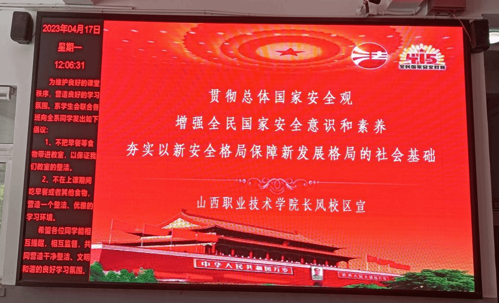 各党总支、各部门因地制宜,充分利用新媒体平台,相应推出了一系列的“国家安全教育日”主题宣传活动。通过升国旗、主题班会、开辟专门展览室或宣传栏等多种形式,深入开展校园国家安全宣传教育活动。通过一系列的安全资讯推送、主题班会、短视频、系部微信公众号、“微博#国家安全日#”开辟专门展览室或宣传栏等内容推送,全院师生更清晰的明白了什么是国家安全,加强了对国家及自身安全的重视,领会了作为当代大学生有维护国家安全的责任与义务,有国才会有家,国泰才能民安,国家安全是我们每个人幸福生活的基石。
