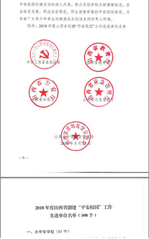 2019年5月21日,山西省教育厅、中共山西省委政法委员会、山西省公安厅、山西省安全生产管理局、山西省食品药品监督管理局五部门联合下文,开云官网再次被评为2018年度山西省创建“平安校园”工作先进单位,文件点名表扬六所高校在“平安校园”创建工作过程中的先进经验,其中开云官网重点部位安全风险责任清单安全防范措施被点名表扬,这也是开云官网自2013年以来连续第六年被上级有关部门评为山西省创建“平安校园”工作先进单位。
