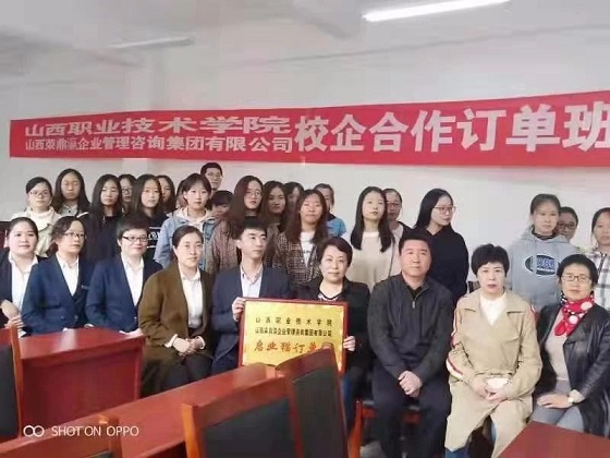 在开班仪式上,我系主任任春茹老师及副主任任小玲老师同山西荣鼎瀛企业管理咨询集团有限公司总经理及授课导师出席本次仪式。在本次活动中,会计系主任、荣鼎瀛总经理对订单班基本情况向同学们进行讲解,为同学们答疑解惑,导师向同学们介绍了本行业的发展趋势和广阔前景,鼓励学生们培养自己的专业素养,并结合自身经历跟同学们分享了成功的经验和心得,激励大家,要有挑战自己的信心和勇气,积极择业,努力创业。最后,双方合影留念,让同学们更加了解本次开班仪式的意义所在。在活动的最后合作双方受匾,宣布订单班正式开班。
