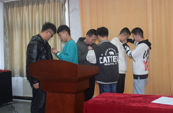 团总支委员为新入团的三位同学佩戴团徽,标志着同学们正式成为共青团员,成为党的后备力量。新入团团员在团旗前庄严宣誓,在今后的学习生活中,他们将继续弘扬党的革命精神,将党的红色基因一代代传承下去,肩负起实现中华民族伟大复兴的重任。