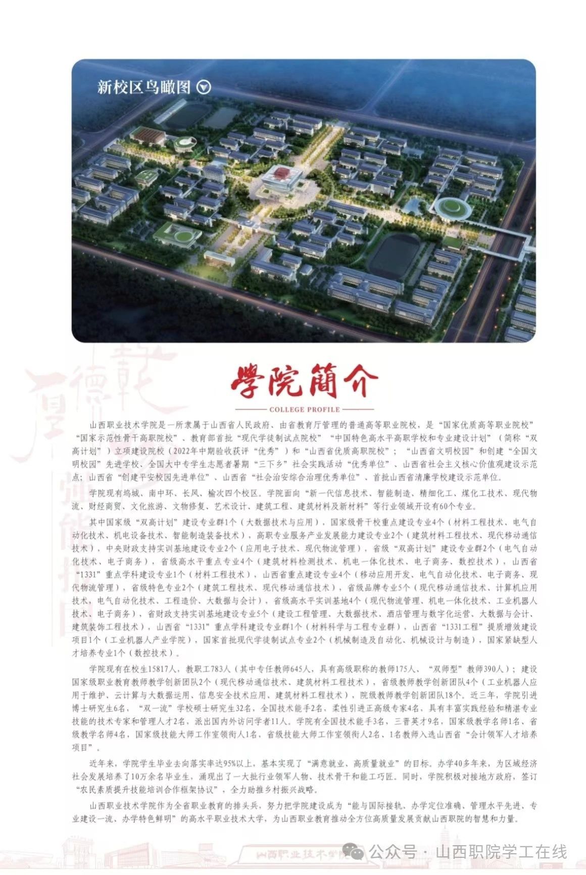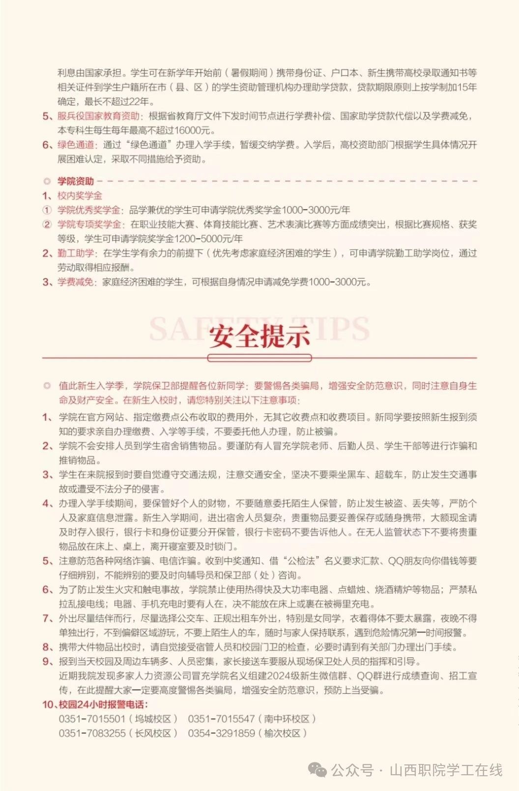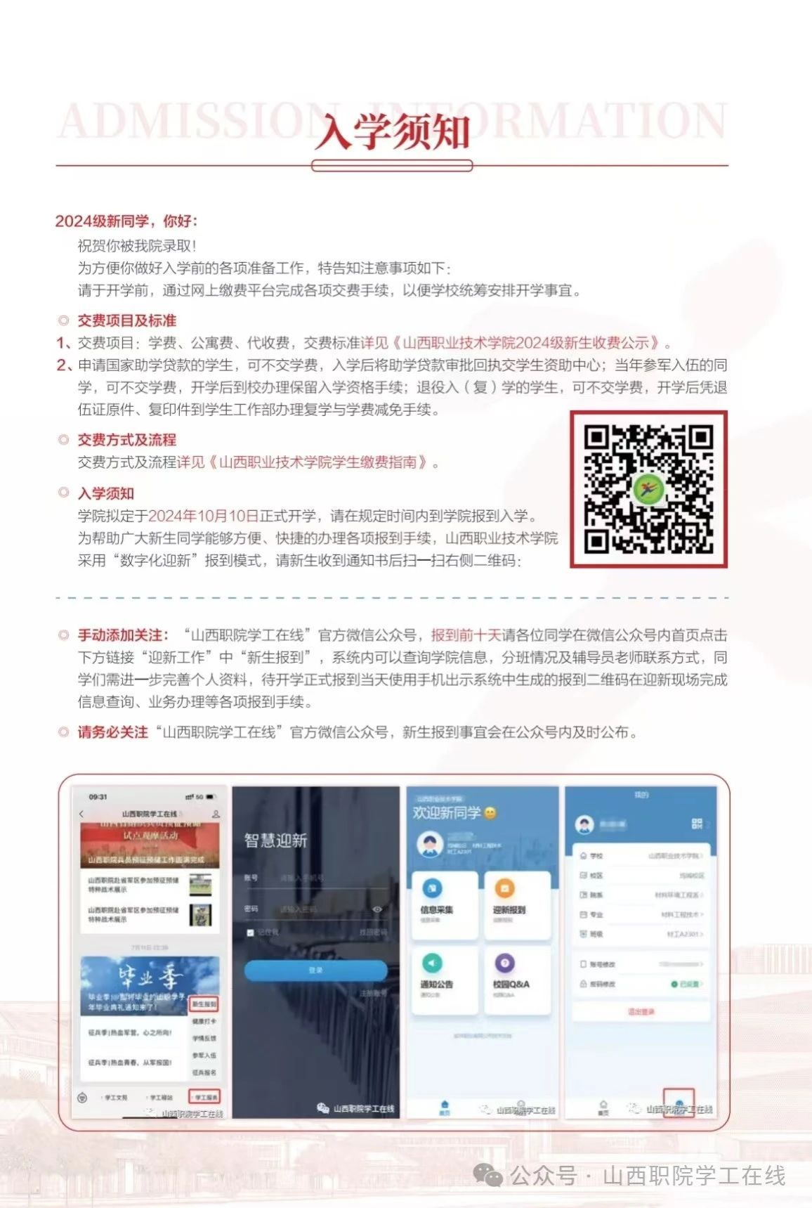 手动添加关注:“山西职院学工在线”官方微信公众号,在开学前半个月(即9月27日)迎新系统将在微信公众号开放,届时请各位同学在微信公众号内首页点击下方链接 “学工服务”——“迎新工作”,查询学院信息并进一步完善个人资料,待开学正式报到当天使用手机出示系统中生成的报到二维码在迎新现场完成信息查询、业务办理等各项报到手续。出于工作的需要,本次新生报到之时,家长等其他陪同人员及送学生的车辆不得进入校园区域。