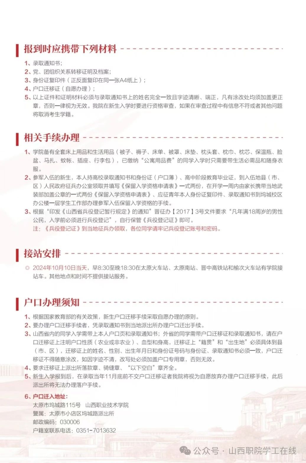 3、山西省内的同学入学需带上本人户口页和录取通知书;外省的同学需带户口迁移证和录取通知书,请在户口迁移证上注明户口性质(农业或非农业)、血型和身高,迁移证上“籍贯”和“出生地”必须具体到县(市、区),迁移证上的姓名、性别、出生年月日和身份证号码与身份证、录取通知书必须一致,户口迁移证不得随意涂改,如因字迹不清, 改写处必须加盖户口专用章, 否则无效。