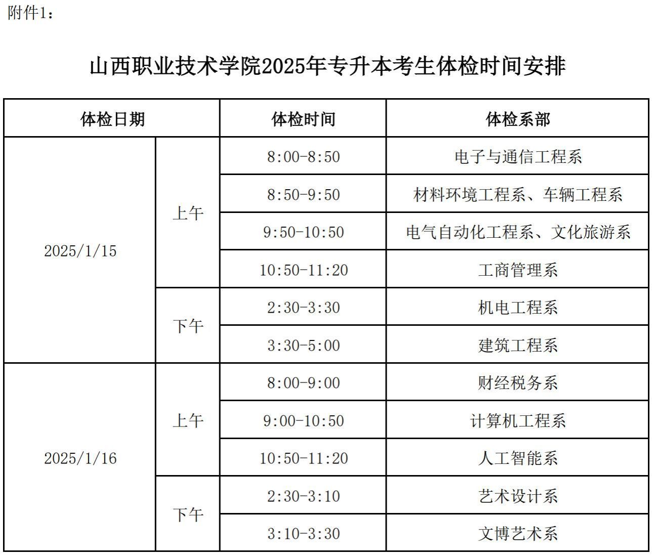 根据太原市招办关于专升本体检工作安排,我学院 2025 年专升 本考生体检时间为 2025 年 1 月 15 日-1 月 16 日。现将体检有关要 求提示如下: