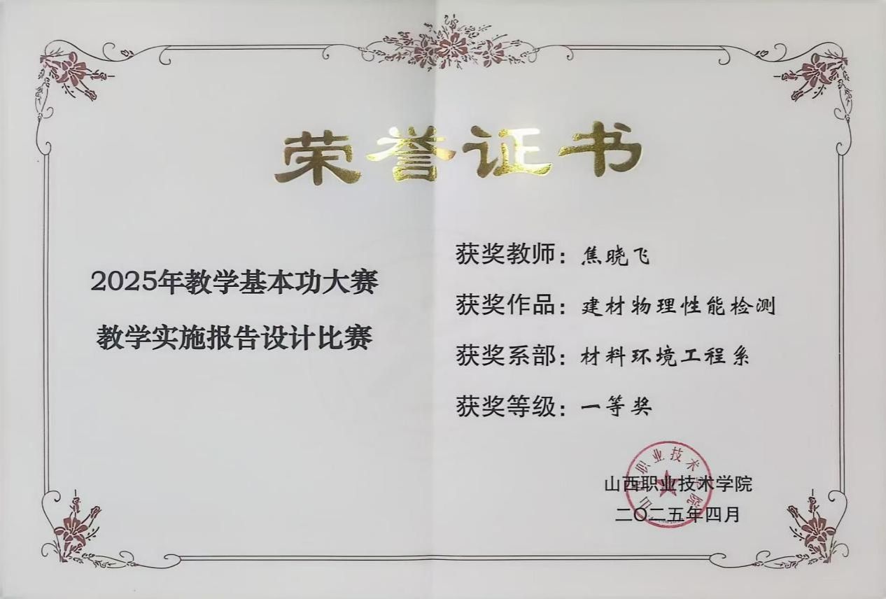 焦晓飞老师在“2025年教学基本功大赛——教学实施报告设计比赛”中,同样荣获一等奖。焦老师精心设计的教学实施报告,精准把握了课程要点,从教学目标的设定、教学方法的创新运用,到教学过程的科学组织以及教学效果的有效评估,都进行了精心雕琢,为获奖奠定了坚实基础。