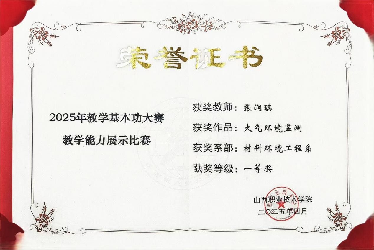 张润琪老师在“2025年教学基本功大赛——教学能力展示比赛”中,荣获一等奖。张老师在比赛中,将复杂的监测原理、先进的监测技术与实际案例深度融合,以生动且富有逻辑性的方式呈现给学生,拔得头筹。其教学过程不仅注重知识传授,更着力于培养学生的实践操作能力与环境监测的前沿思维。