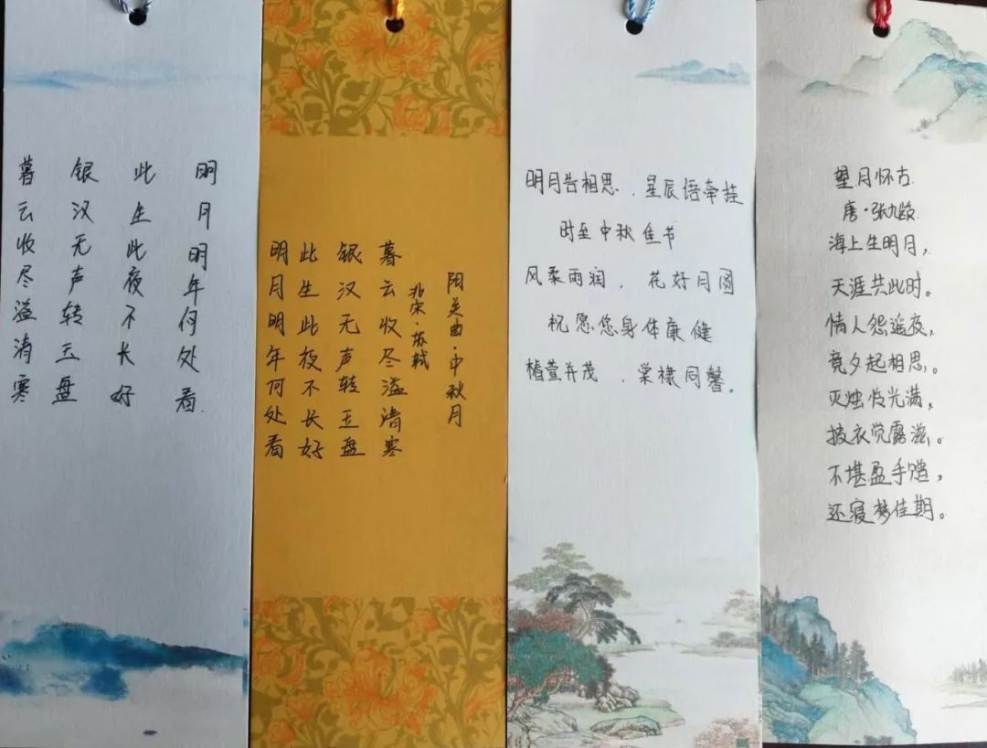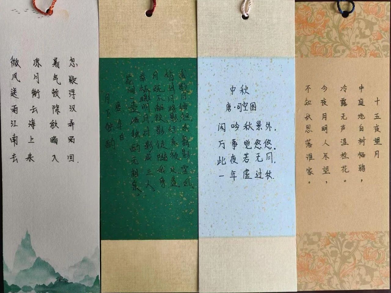 活动中同学们亲手制作了精美的中秋主题书签,在书签上写下了自己喜爱的诗句,每一张书签都蕴含着制作者的心意和创意,既是对传统文化的一种传承,也是对中秋佳节的美好祝愿。