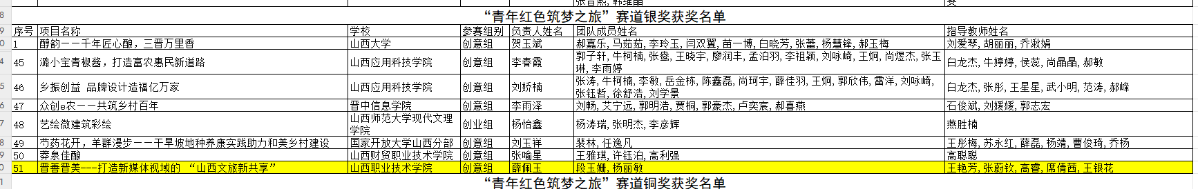 数字技术产业学院王银花,席倩茜,高睿老师带领薛佩玉等同学参赛的《晋善晋美---打造新媒体视域的 “山西文旅新共享”》获青年红色筑梦之旅赛道创意组银奖;
