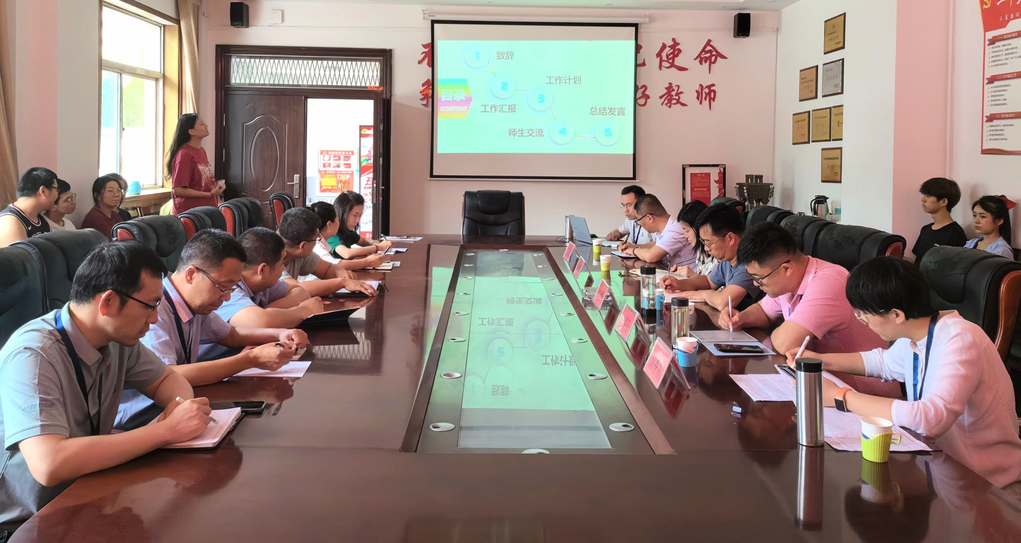 会议伊始,由讲师彭俊杰进行会议致辞,并汇报了数字技术产业学院本学期专业课教学工作,职业素质讲师席倩茜,就业经理王银花,教学助理李星分别针对职业素质课教学及招生宣传、学生实习与文化建设三个方面进行工作汇报,接着彭俊杰汇报了下一步工作计划。