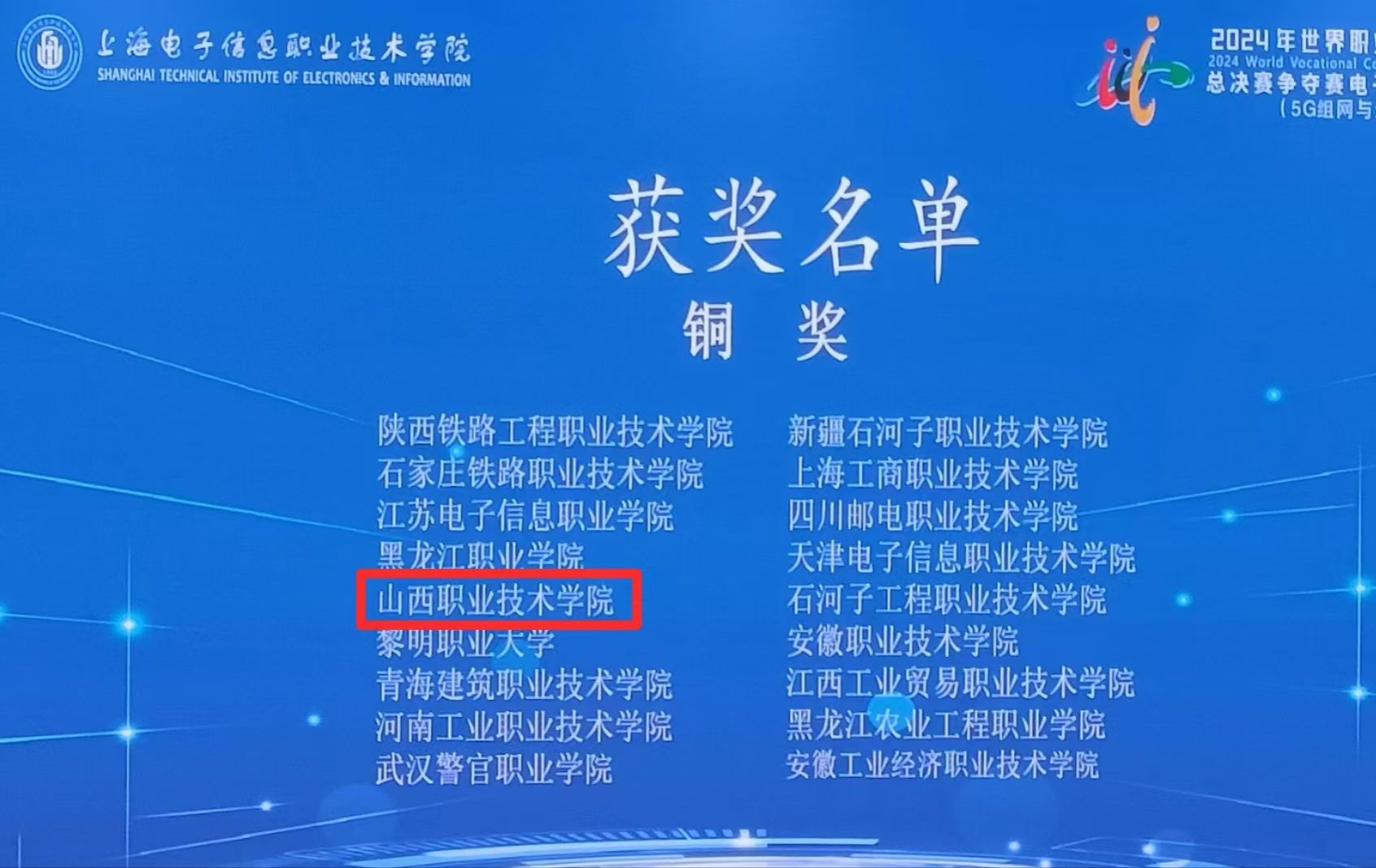 10月26日至27日,2024年世界职业院校技能大赛高职组“5G组网与运维”赛项在上海电子信息职业技术学院举办,由电子与通信工程系-数字技术产业学张媛、魏鸿宇、常庆林,张建基4名同学组成的代表队荣获铜奖。