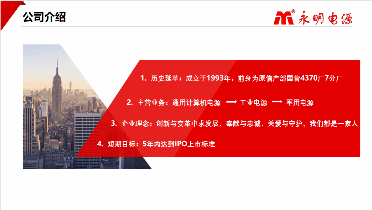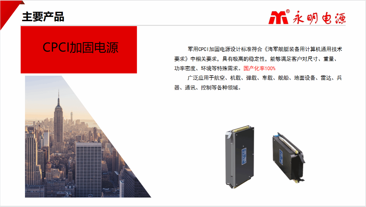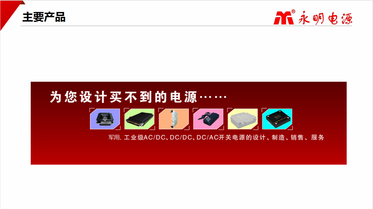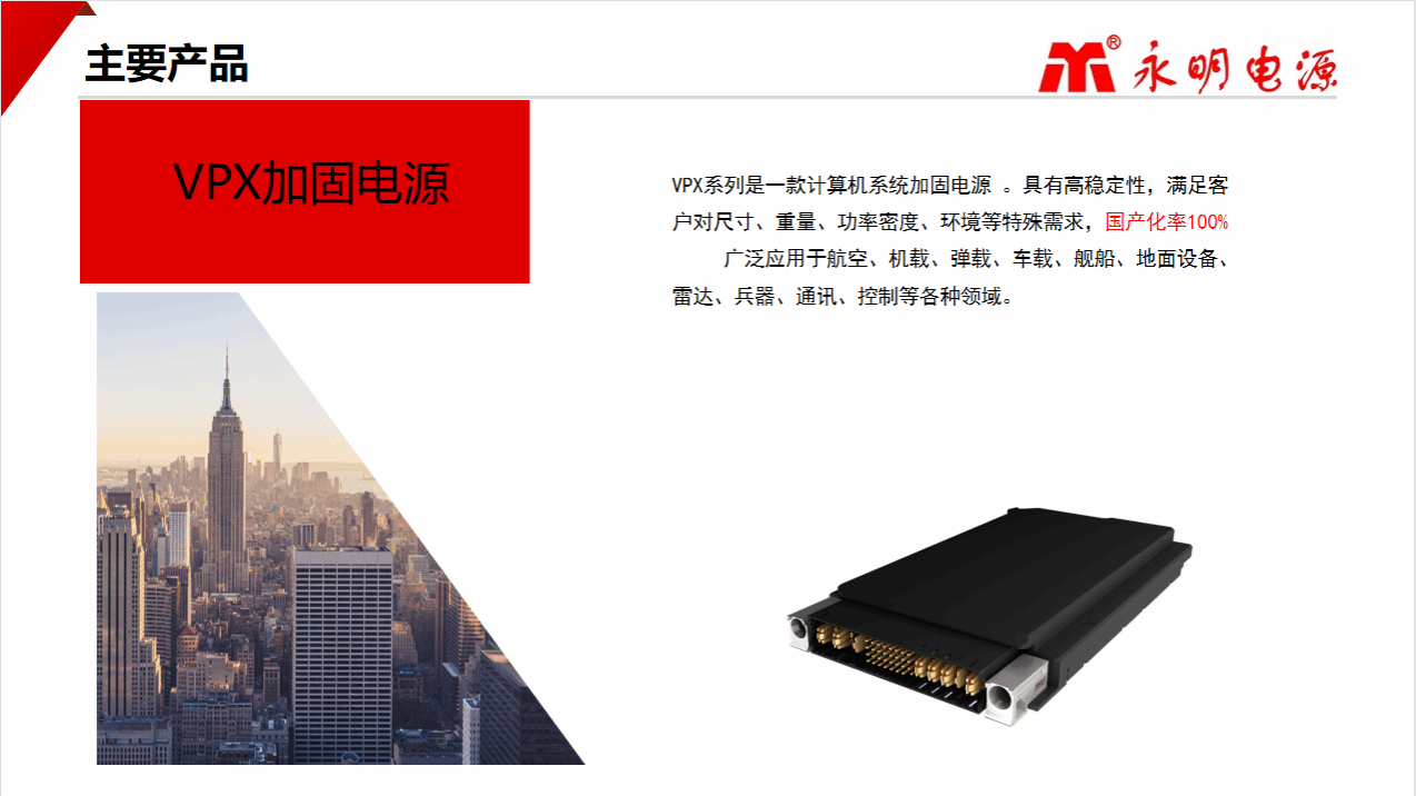 太原永明恒动源电子有限公司成立于1993 年,是专业从事军用及工业电源研发、设计、生产和销售的企业。永明电源品牌历经三十年的持续发展和积累,产品已达到种类齐全、技术领先。其中 VPX系列加固电源、CPCI 系列加固电源、军用 AC/DC、DC/DC模块系列电源、加固便携机适配器等,已广泛应用于航天、船舶、车载等领域。