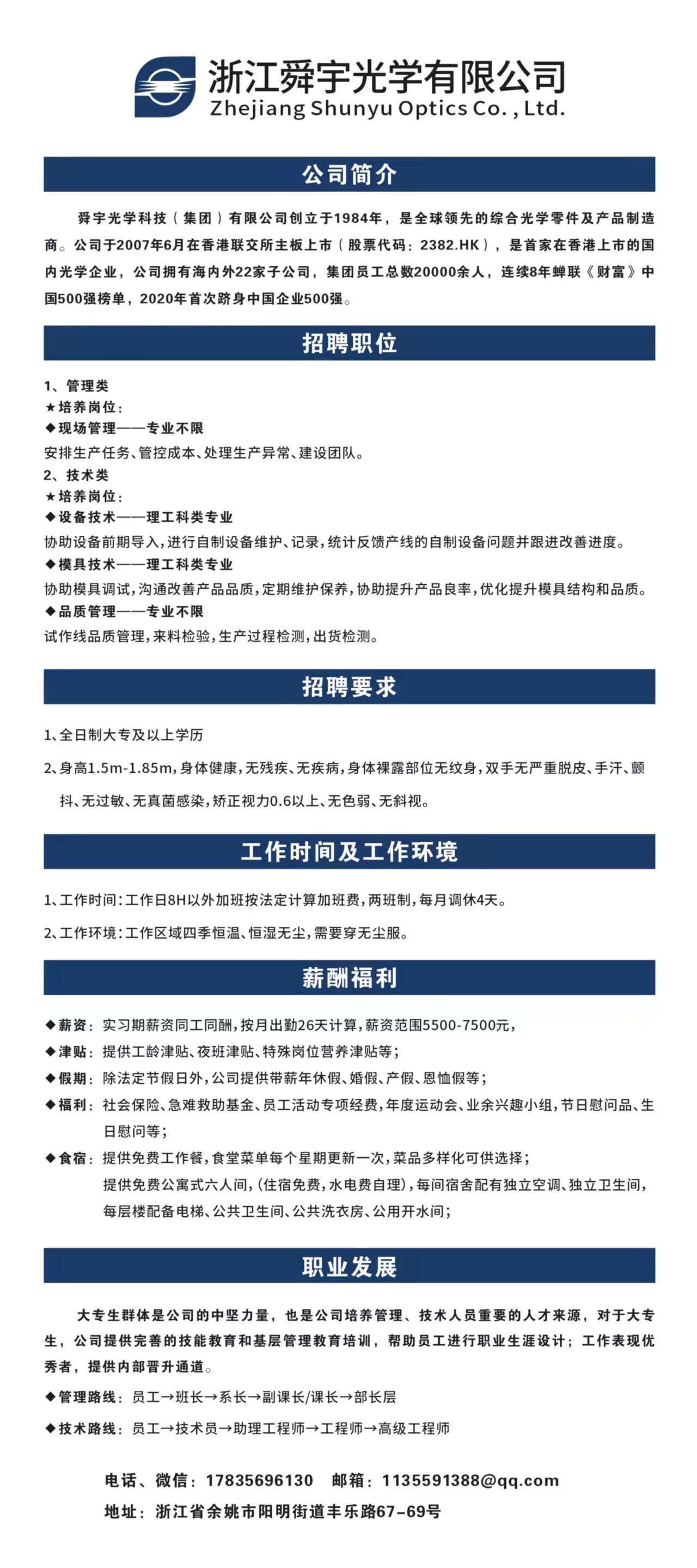 浙江舜宇光学科技(集团)有限公司招聘信息