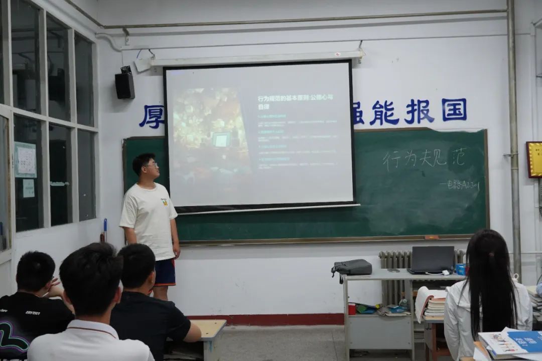 本次班会由各班负责人从行为规范方面向学生提出了要求:注意个人形象,举止文明,注意个人卫生及宿舍卫生,与他人交谈时文明礼貌、最后,各班负责人进行总结,希望同学们遵守大学生的各类日常行为规范以及校纪校规的相关规定,时刻绷紧安全这根弦,规范个人日常行为,共同维护和谐的校园秩序。