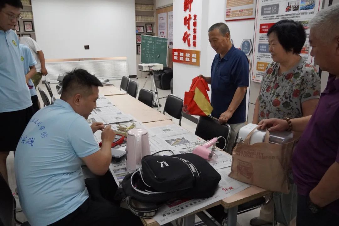 上午,实践团师生来到了常青藤社区,先组织对应专业的队员在社区中心设立了临时家电维修站,免费为居民们提供小型家电的检测与维修服务。