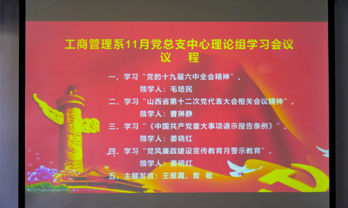 学习会上,由系党总支书记毛培民同志领学了“党的十九届六中全会精神”;系主任曹琳静同志领学了“山西省第十二次党代表大会相关会议精神”;系党总支副书记姜晓红同志领学了《中国共产党重大事项请示报告条例》和“党风廉政建设宣传教育月警示教育”;系副主任王雁霞同志就提高政治站位、坚持不断学习和实践、立足本职工作、加强六中全会的宣传等方面进行了主题发言;系副主任智敏同志针对教师党员应该树立服务意识、“四有”好老师的标准等方面进行了主题发言。