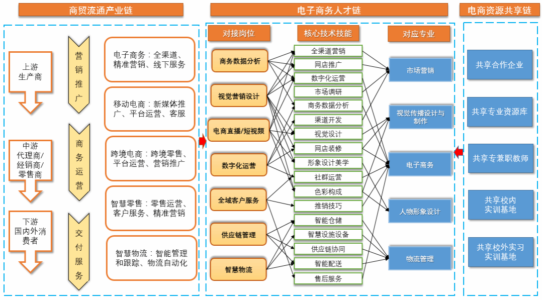 电子商务专业群精准对接商贸流通服务业发展需求,服务于商品生产到终端消费市场中商贸流通服务业链的后端,强化电子商务提质增效、商贸物流转型升级,数据资源规范共享、供应链协同创新。电子商务专业群的各专业以系统化全渠道管理为核心思想,协调商流、物流、资金流、信息流四流合一,确保整个供应产业链运营最优化;以线上线下协同共享与数字化经济转型为切入点,抢抓新时代数字化变革需求,产业数字化、数字产业化机遇;以电子商务全域运营、新媒体营销、人工智能等新兴信息技术为保障,创新电子商务运营、全渠道营销推广、物流运作管理、新零售运营管理模式,提高商务流通效率,挖掘业务运作深度。
