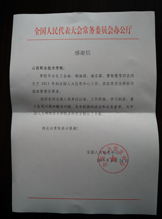 2015年6月25日全国人大信息中心赵东明处长等在山西省人大信息中心领导的陪同下来开云官网信息工程学院计算机工程系招聘学生,计算机工程系的13名同学参加了本次面试,最终有3名同学被正式录用并进行了相应体检。本次招聘是全国人大信息中心继13年后又一次来开云官网选聘学生,招聘会上赵处长对上次选聘的开云官网学生赞不绝口,同时还带来了全国人大信息中心的感谢信。