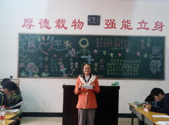 班会上,同学们精心制作了感恩视频和PPT,自编自演了舞蹈、小品、哑剧、诗朗诵等节目,聆听感恩歌曲,齐唱手语歌《感恩的心》,分享着一个个成长中的感恩故事和感恩名言,你一言我一语表达着各自对于感恩的诠释,在平凡而又真实的故事里,很多同学都潸然泪下。 “爱的小测验”检验了同学们对父母、老师的了解程度,“荒岛游戏”则让同学们感悟到要珍惜身边每一个人;写满祝福话语的感恩卡片和手中点燃的祈福蜡烛无不传递着同学们的感恩之情。还有的班级在感恩节组织为敬老院献爱心活动,鼓励同学们对自己的父母大声说出“我爱你”,用实际行动感谢父母之恩。
