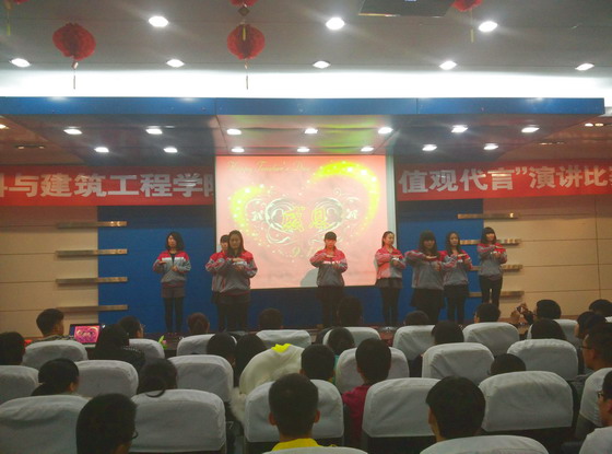 检测A1201班、硅C1301班、检测A1401班和复材A1401班联合举办“恩泽万物 感在心中”为主题的班会现场