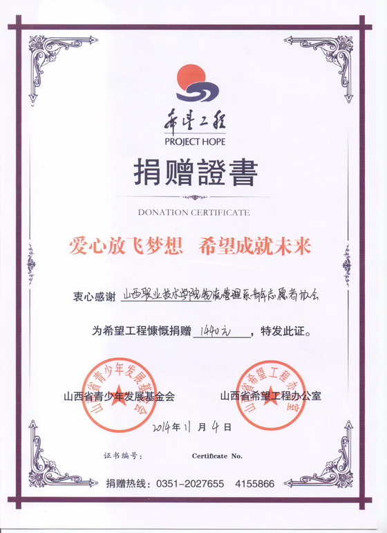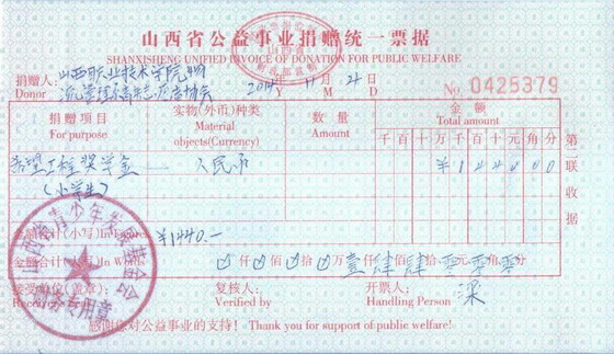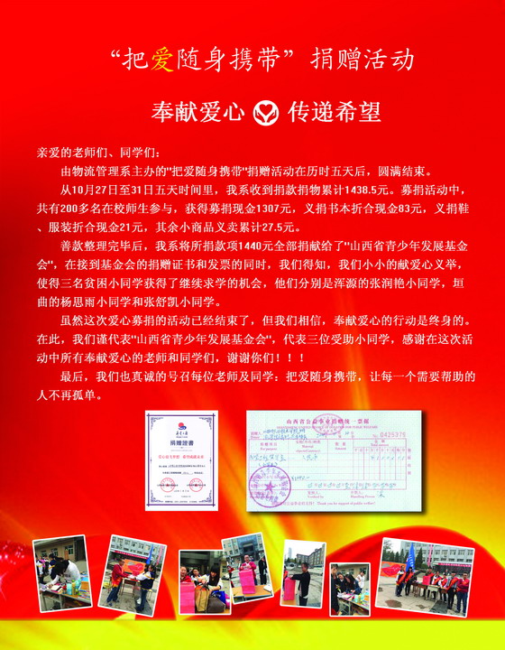 善款整理完毕后,物流管理系将募得款项1440元全部捐献给了“并山西省青少年发展基金会”。基金会为物流管理系开具发票颁发了捐赠证书。物流管理系这一小小的献爱心义举,帮助了三名贫困小同学,使他们得到梦寐以求的升学机会。三名受到帮助的小同学分别是山西省浑源县的张润艳、山西省垣曲县的杨思雨和张舒凯。他们特别对物流管理系捐助者表示了感谢!