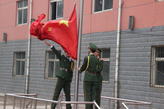 升旗仪式开始,英姿飒爽的国旗护卫队迈着铿锵有力的步伐走向国旗台。鲜艳的五星红旗在激昂的《义勇军进行曲》中缓缓上升,徐徐展开,迎风飘扬。全体师生行注目礼。