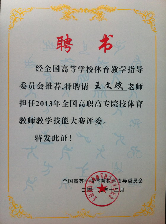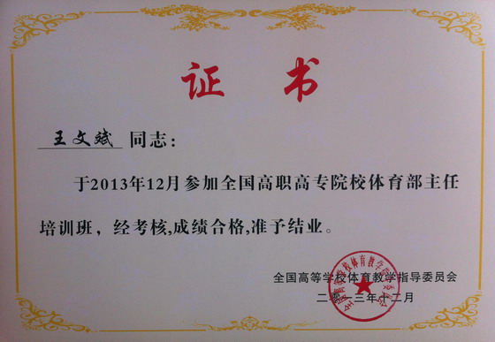 另外,本次大赛同时聘请开云官网社体部主任王文斌老师为评委,并参加了全国高职高专院校体育部主任培训班,并授予证书。