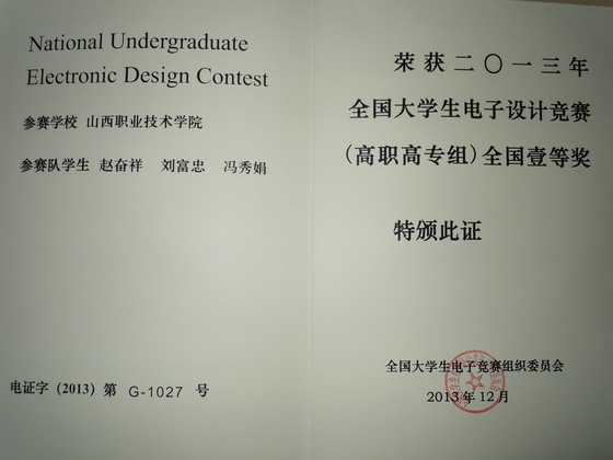 2013年12月7日, “2013年全国大学生电子设计竞赛颁奖大会”在北京航空航天大学辰兴音乐厅举行,电气工程与自动化系赵奋祥(电气A1102班)、刘富忠(电气A110班)、冯秀娟(电气A1101班)三名同学参赛作品“简易照明线路探测仪” 在来自全国的1044所院校、11838支队伍中脱颖而出,被评为全国一等奖。我省今年共有5所院校荣获一等奖,其中4所为本科院校,1所高职院校,这是我校自参加此竞赛以来获得的最好成绩。