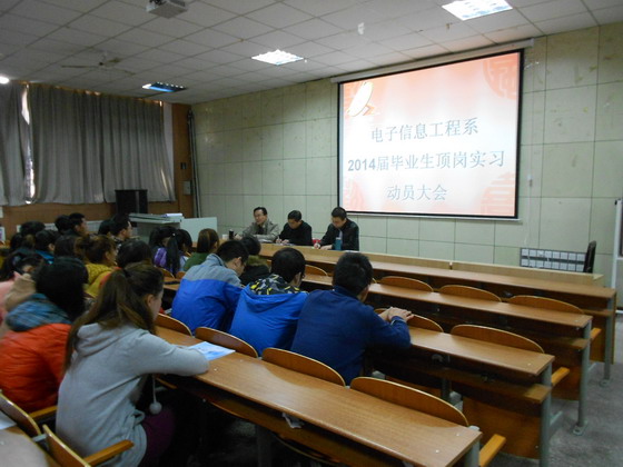 为了进一步完善电子信息工程系毕业生顶岗实习和就业工作,引导学生做好顶岗实习的心理准备,11月29日上午电子信息工程系在信息工程学院实训楼四楼会议室召开了2014届毕业生顶岗实习动员大会。电子系系主任陈立平、党总支书记程革及毕业班班主任和全体学生参加了此次会议。