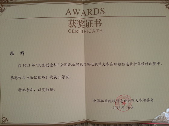 为推动职业教育教学改革创新,提高教师教育技术应用能力和信息化教学水平,促进信息技术在教育教学中的广泛应用,教育部于2013年10月19-21日在南京举办了第四届全国职业院校信息化教学大赛的决赛,思政部杨辉老师代表山西省第一次参加了高职组“职业素养与就业创业能力课程组”的教学设计比赛,并荣获三等奖。通过此次比赛让我们明确了在今后的教学中要积极应用信息化技术,使信息化更加生动、深度的融入教学的各个环节。