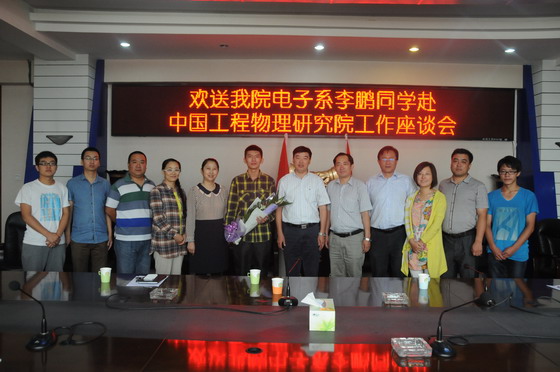 9月12日上午,电子信息工程系在材料与建筑工程学院主楼四层楼会议室召开了欢送2013届毕业生李鹏同学赴中国工程物理研究院工作座谈会。学院副院长康同生、就业指导中心主任张素梅、学生处处长蔚志坚、信息工程学院副院长拜秀萍、电子系党总支书记程革、就业指导中心老师及系部老师学生代表参加座谈会,座谈会由电子系书记程革主持。
