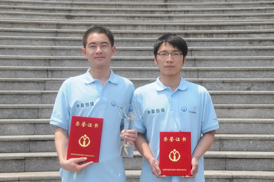 图为许林更(右)、郝海龙(左)2012年全国职业院校技能大赛“中盈创信”杯电子产品检测与维修(芯片级)赛项团体一等奖后在学院的留影