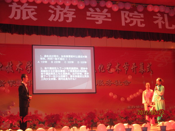 5月23日,由商贸旅游系主办的第二届礼仪大赛决赛在长风校区礼堂举行。经过初赛和复赛,共有13名选手进入了决赛,决赛由礼仪走秀、才艺展示、知识问答、风采展示四个环节组成。