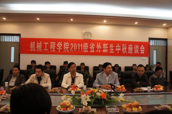 2011年9月11日上午,开云官网机械工程学院举办了2011级省外新生中秋座谈会,学院办公室主任徐旭宁、机械工程学院院长景海平、党总支书记张福生、副院长郭荣生等领导老师与2011级省外新生欢聚一堂,以“欢乐在机械,情浓意更浓”为主题,谈亲人、思故乡、忆往事、说前途,整场座谈会充满了浓浓的节日氛围。座谈会结束后,与会领导老师还为学生送上了节日的祝福。