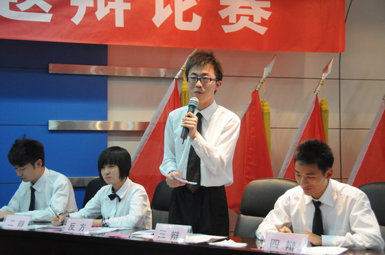 第一回合正反双方三位辩手分别对自己的观点做了开篇立论,双方辩手善于寻找切入点,进行层层剖析,用通俗幽默的快板式语言陈述观点。第二回合是自由辩论环节。辩手们在对方发言时,做好记录,掌握对方观点及主要依据,捕捉漏洞,在回答和反驳时针锋相对、步步紧逼、唇枪舌剑、互不相让,现场气氛迅速升温。辩手们都以扎实的论据、严谨的语言做着激烈的思想碰撞,不时夹杂着幽默的火花,充分调动起了台下观众的热情。最后双方四辩根据赛况做了精彩的总结陈辞。