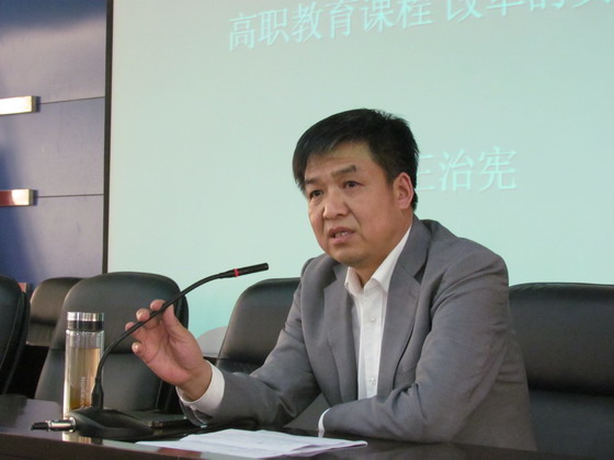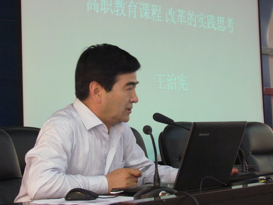 在怎么改的问题上,王治宪教授结合教高2006年16号等文件指出,高职教育必须开发和构建基于工作过程系统化的学习领域课程体系,并就高职项目课程体系开发原则、工作任务分析、项目课程的设置、课程标准编制、学习项目设计、教学材料开发六个方面进行了讲解。王治宪教授在讲座的最后还就他本人对高职教育课程改革的一些思考和大家进行了交流。