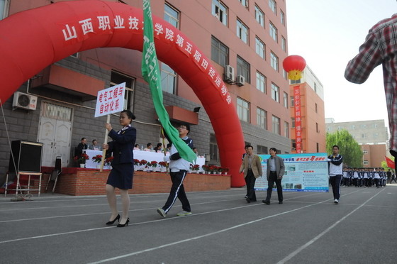 在激昂的运动员进行曲伴奏下,国旗方队、院旗方队、院徽方队、院训方队、彩旗方队、裁判员方队及12代表队队踏着整齐的步伐,喊着嘹亮的口号步入赛场。