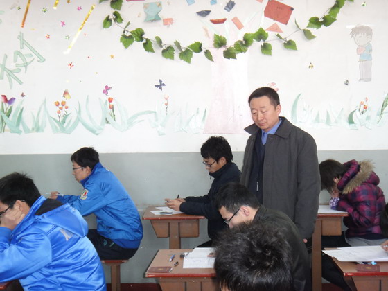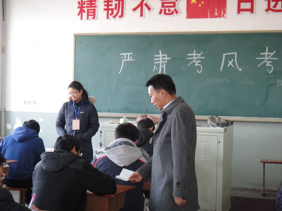 图为丁怀民院长视察考场,当看到一个学生是元旦生日时,向该生表示了衷心的祝福,该生愉快地回答谢谢老师。