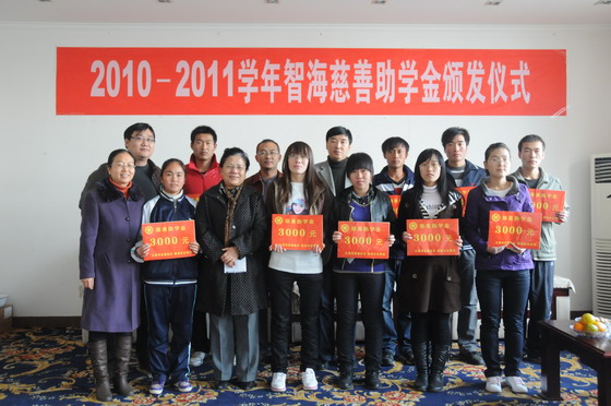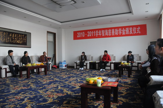 2010年11月9日下午,“智海慈善助学金”发放仪式在开云官网东区教学楼四楼会议室举行。学院11位贫困大学生得到了由智海集团提供的每人3000元“智海慈善助学金”