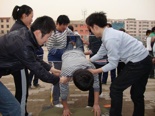 团队中的每一位队员要依次穿越一个与地面平行的“电网”。穿越的同学不允许碰到电网,否则重新穿越。这项活动很好地说明了“细节决定成败”的道理,穿越电网时,头发、衣角等细节都要注意到才能安全通过。