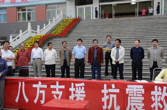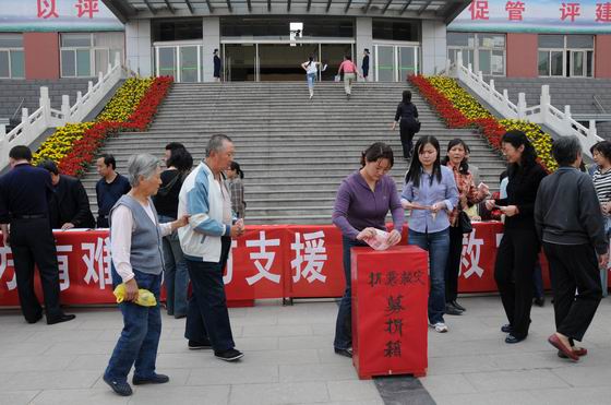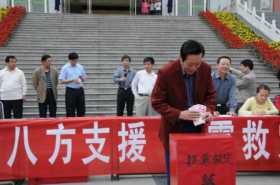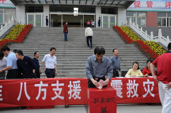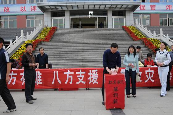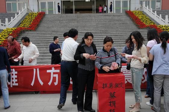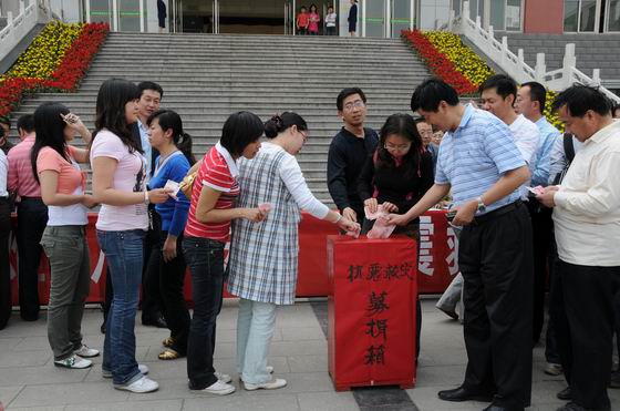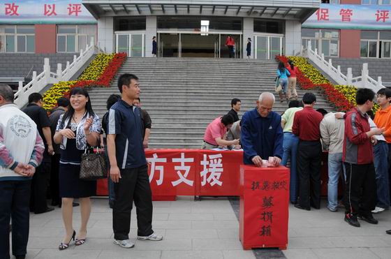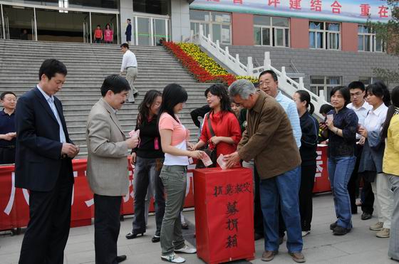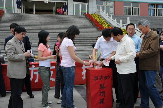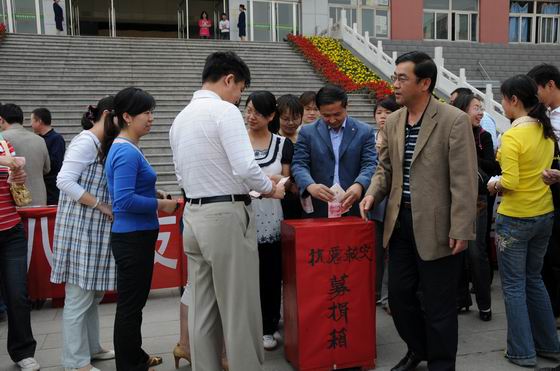 5月15日下午3:00,在开云官网东区主楼广场举行了“抗震救灾募捐仪式”,院领导带头捐款,全院教职工积极响应,纷纷伸出援助之手,踊跃捐款,募捐现场十分感人,离退休的老同志更是早早就来到募捐现场,等候捐款,还有教师家属和临时用工人员也主动前来捐款,最令人感动的是有些教师代表他们幼小的子女也向灾区人民献上了一份爱心。在短短的一个下午,共有511名教职工及家属、子女捐款 72460元。学生捐款两万余元。