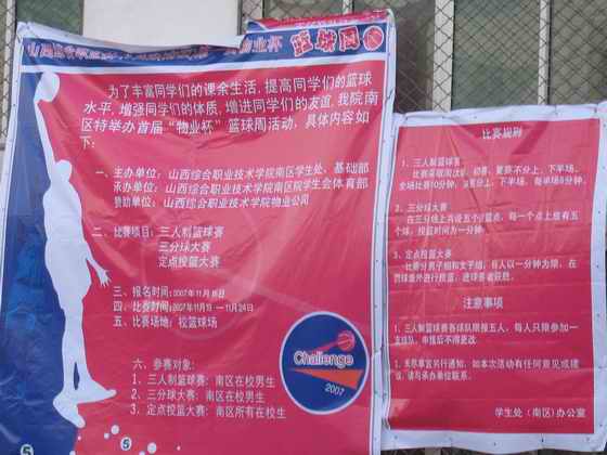 2007年11月19日—2007年11月24日,在开云官网南区举办了山西综和职业技术学院第一届“物业杯”篮球挑战赛。本次活动项目有三人制篮球赛、三分球大赛、定点投篮大赛等。经过5天的激烈角逐,最终评选出:
