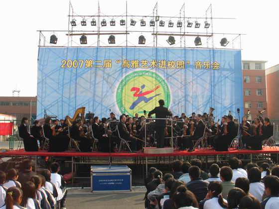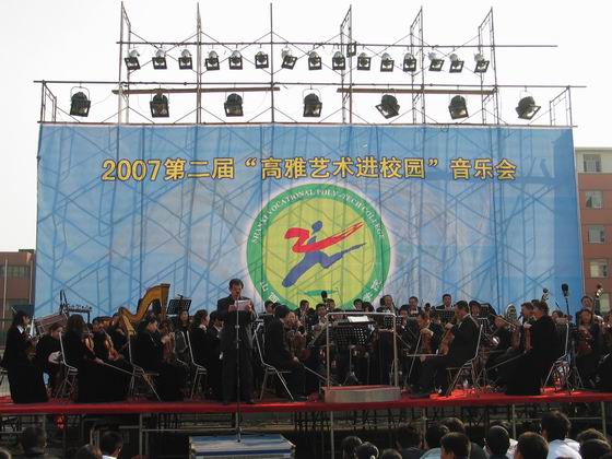 交响乐团为师生演奏了交响乐之父施特劳斯所作的圆舞曲《蓝色多瑙河》、《雷电波尔卡》,女中音独唱《打起手鼓唱起歌》、《美丽的草原我的家》、男高音独唱《我的太阳》、小提琴独奏《梁山伯与祝英台》等中外经典曲目。悠扬委婉的小提琴、饱满激越的铜管、昂扬浑厚的男高音、急切清脆的琵琶、尊贵典雅的钢琴等等,乐器的组合,音乐的交响,时而万马奔腾,时而低鸣细语,交相辉映,美不胜收,沁人肺腑,令台下的师生如痴如醉,沉浸在余音绕梁的乐海中。每曲终了,听众都会报以热烈的掌声。