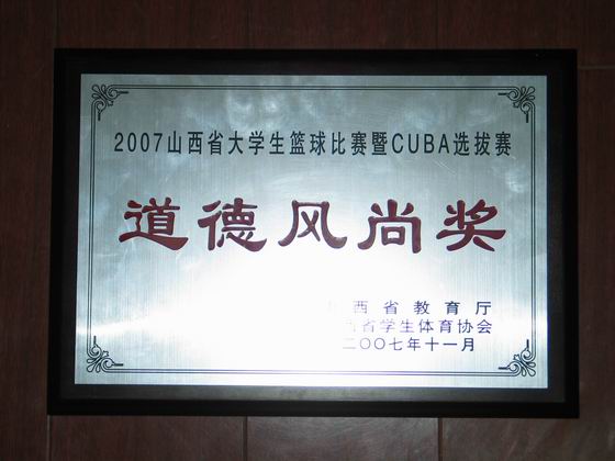 开云官网男子篮球队在山西省2007年大学生篮球联赛暨CUBA选拔赛(山西赛区)中表现出色,取得第四名的好成绩,并获得道德风尚奖。另外,篮球队主教练牛亮星获得优秀教练员称号,队员胡斌获得优秀运动员称号。