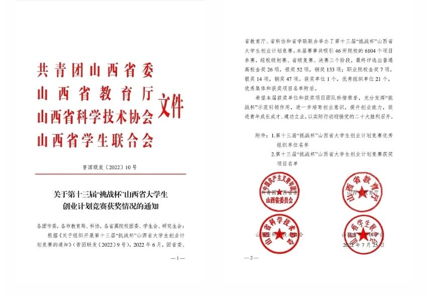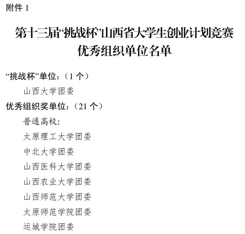 7月25日,山西省第十三届“挑战杯”大学生创业计划竞赛终审决赛落下帷幕,由共青团山西省委、山西省教育厅、山西省科学技术协会和山西省学生联合会联合发布了第十三届“挑战杯”山西省大学生创业计划竞赛获奖名单。