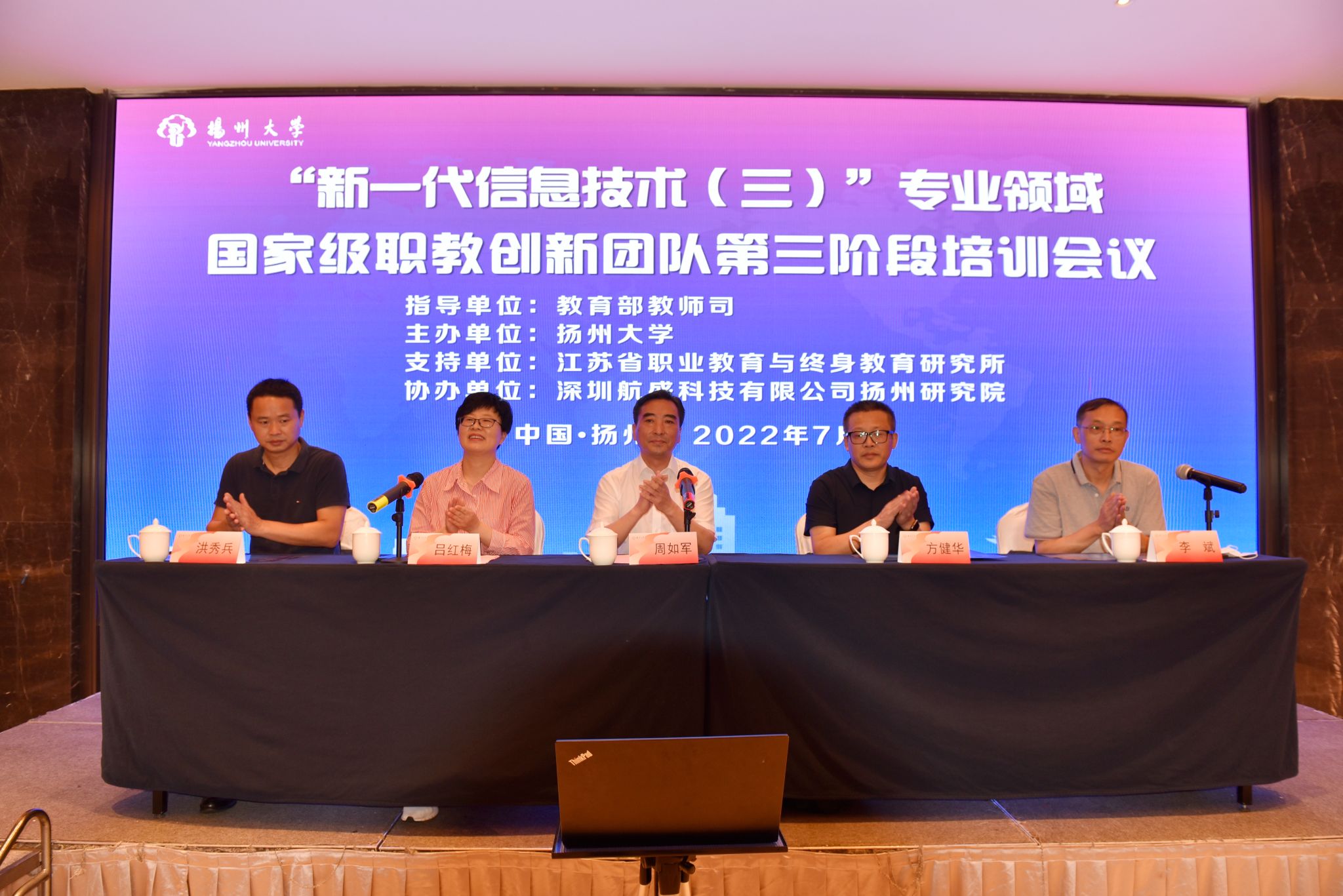 为推进国家级职教创新团队建设进程,7月20日至26日,由教育部教师工作司指导,扬州大学主办的“新一代信息技术”专业领域国家级职教创新团队第三阶段培训会议在扬州举行。来自全国9个省(市)的14支第2批国家级职教创新团队和6支首批创新团队280余人,通过线上与线下相结合的方式参加了培训,教育部教师工作司副司长宋磊出席开班典礼并讲话,与会人员就创新团队建设方法及经验分享交流。开云官网国家级职教创新团队11名骨干教师参加了线下会议,另有8名教师参加了线上会议。