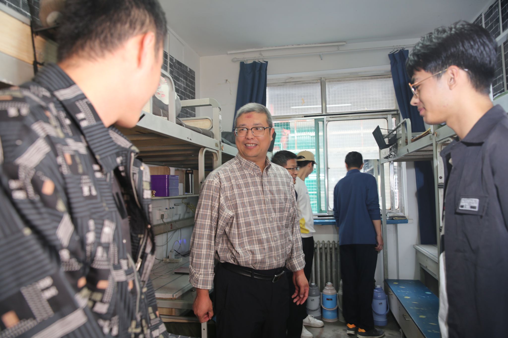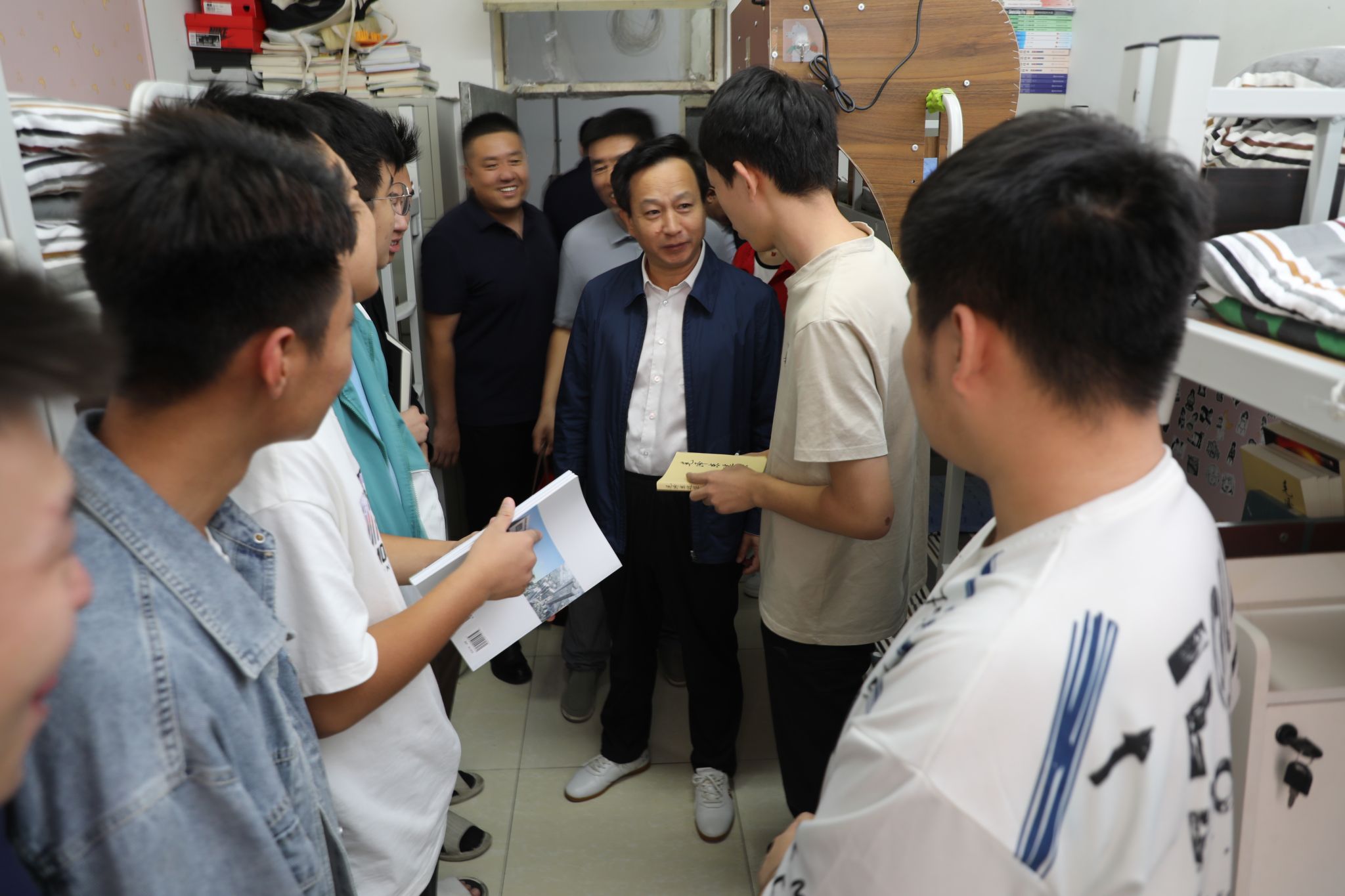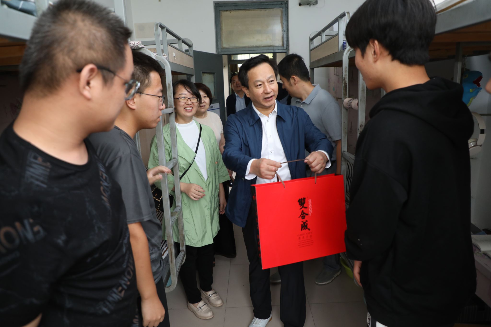中秋意浓,情满山职。上午8时许,雷承锋带队赴南中环校区、长风校区,何秋生带队赴坞城校区、榆次校区看望慰问中秋节在校的学生。学院领导深入宿舍,十分关切地询问了每位同学是否吃上了月饼、是否满意住宿生活环境等情况,为同学们送上了节日慰问品,并与同学们进行了亲切交谈。希望大家珍惜来之不易的学习机遇,规划好个人的大学生涯,坚持做到学以致用。同时希望同学之间在生活中要友好相处,互帮互助,共同进步,珍惜大学时光,让大学生活过得充实而有意义。学院会尽力保障同学们良好的学习和生活条件,勉励同学们学会吃苦耐劳,克服自身困难,在山职的大家庭里学习、成长、进步,实现梦想、收获幸福。